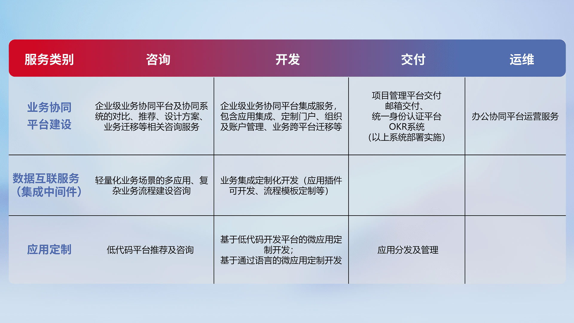 针对钉钉、、、、企微、、、IDaas等平台级产品提供产品的规划、、、、方案、、、、交付、、定制化开发等服务,,,,实现如统一协同办公、、智能客户服务、、、混合会议管理、、智能数据查询、、等业务场景,,,实现数字化转型。。